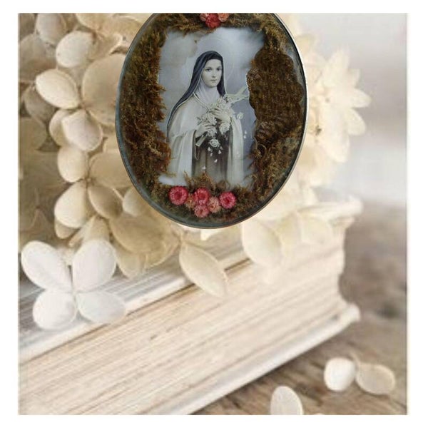 Bring a poetic and spiritual accent to your home with this authentic French devotional frame from the 1920s. Featuring a tender image of Saint Thérèse of Lisieux, lovingly known as The Little Flower, this oval-shaped piece is protected by its original curved glass and adorned with a delicate arrangement of natural dried flowers.