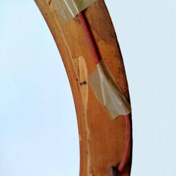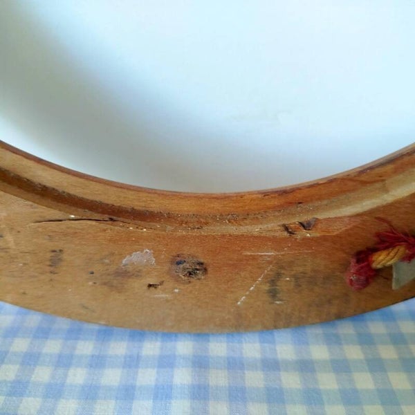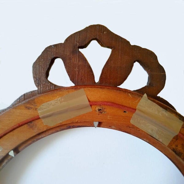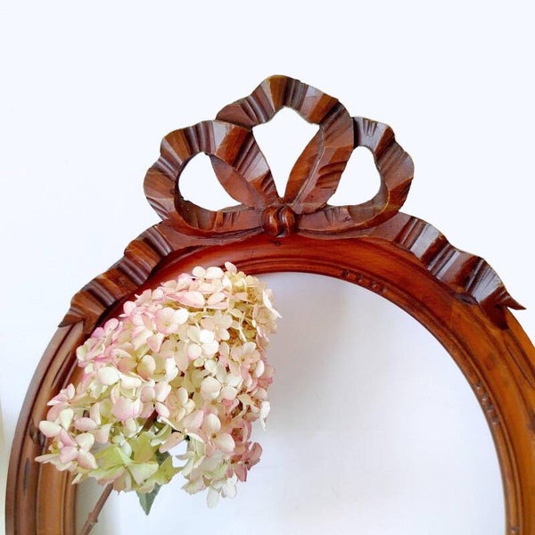 This antique oval wooden frame, dating from the 1920s, is a beautiful example of Louis XVI style. With its delicate molding and carved ribbon motif, it adds a refined French touch to shabby chic, French country, or garden-inspired interiors.