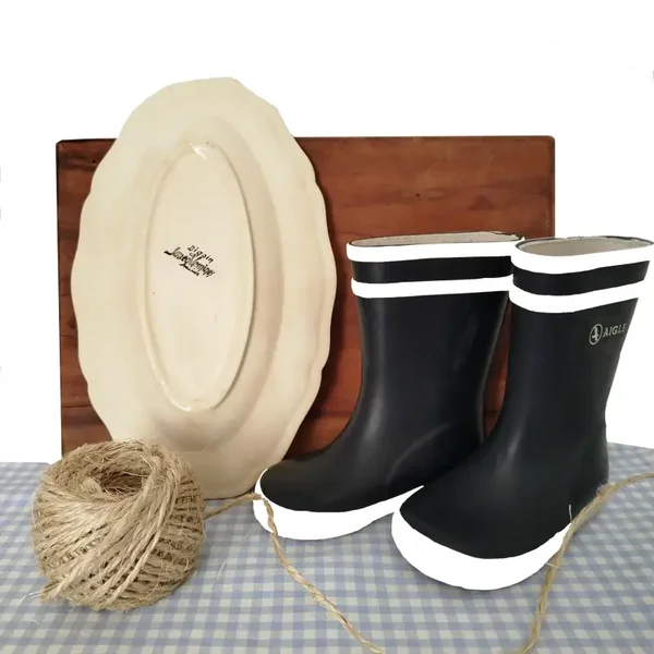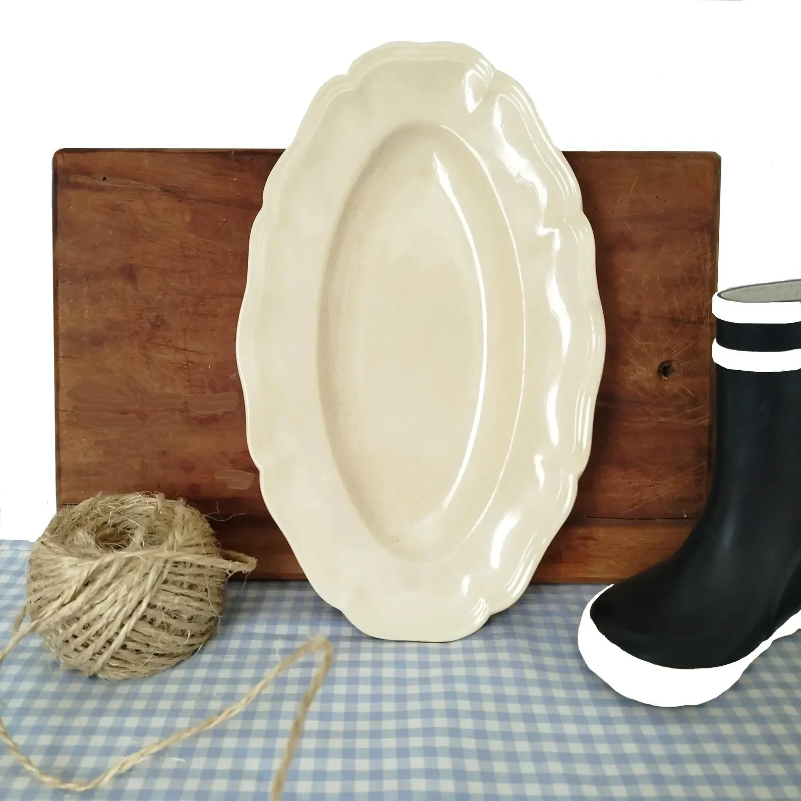 This elegant oval faience plate from Sarreguemines, France, dates from the 1920s and features a scalloped edge with a gentle beige patina. It carries the quiet charm of family tables and Sunday rituals, making it perfect for wall display, wedding styling, or as a poetic accent in a rustic or coastal interior.