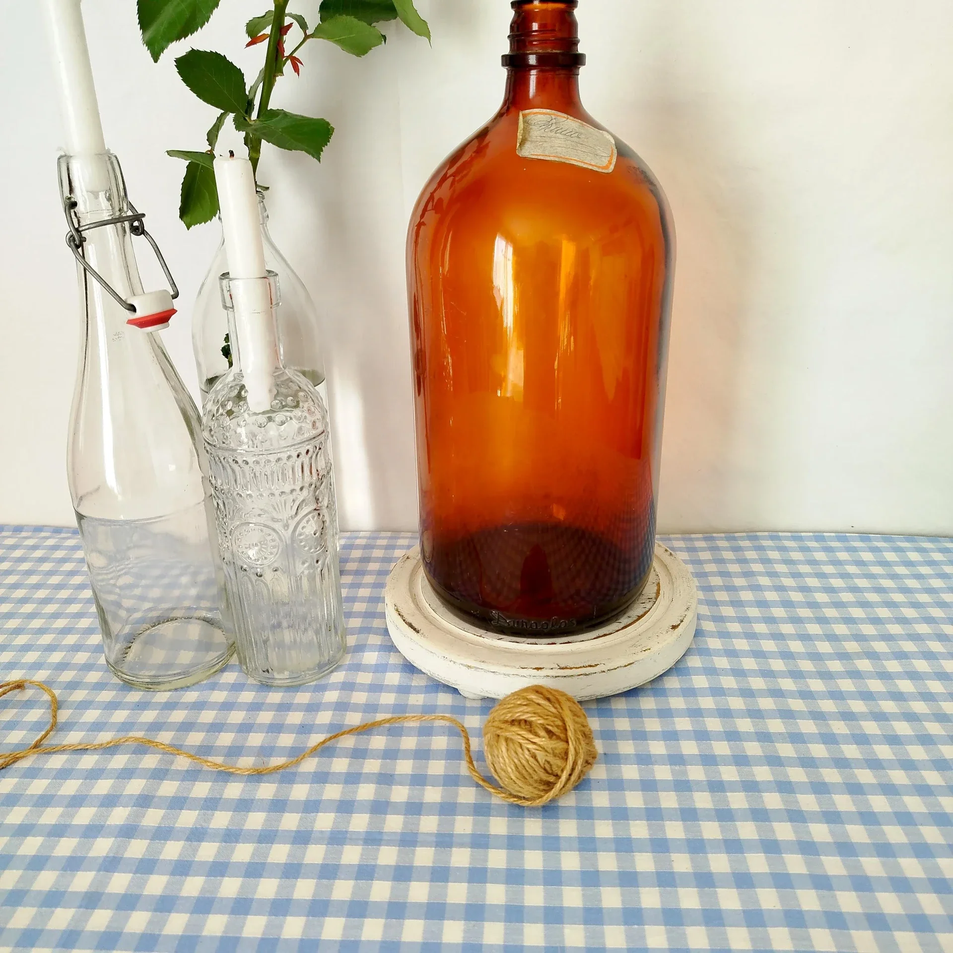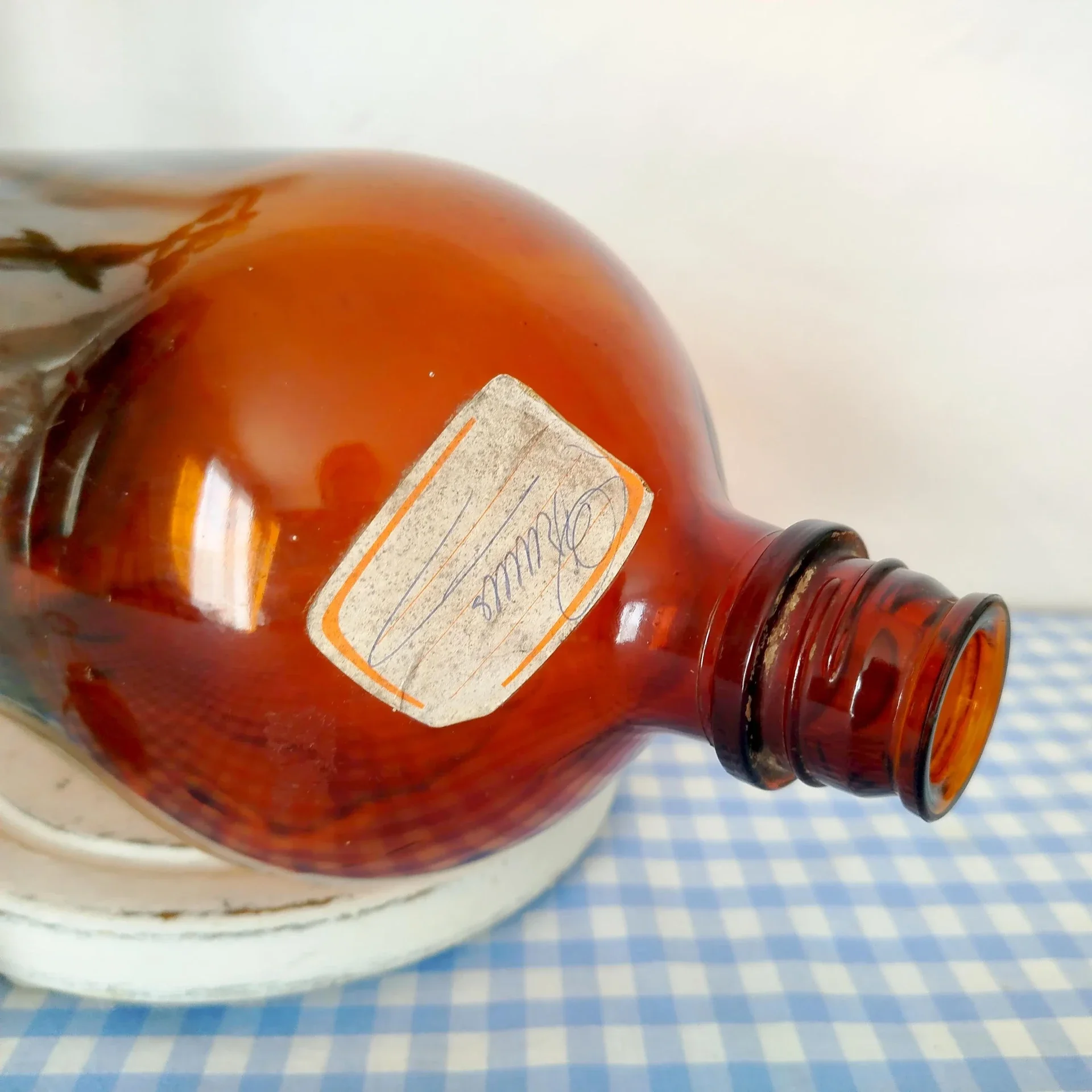A beautiful amber glass carboy from mid-century France, also known as a Dame-Jeanne bottle, with a generous 4-liter capacity and a sturdy side handle. Its warm hue and organic curves make it a perfect accent for boho interiors, rustic kitchens, or vintage wedding setups.